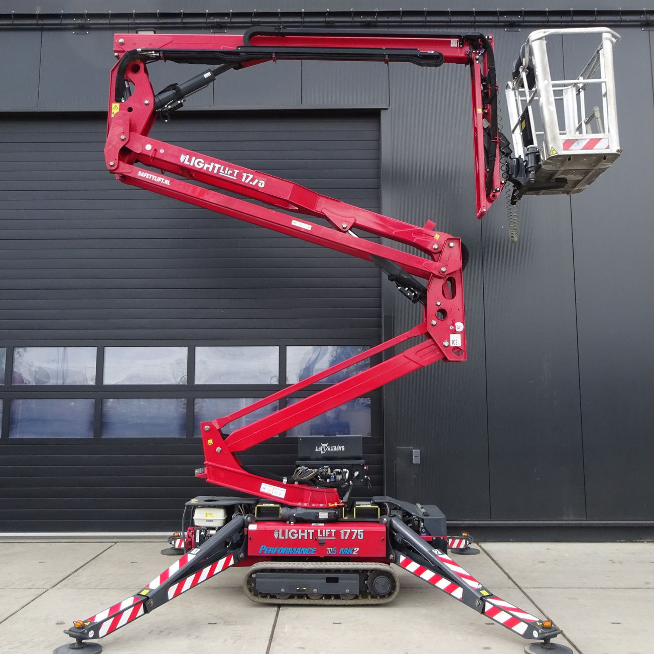 Met een maximale werkhoogte van 17 meter, een zijdelingse reikwijdte tot 7,50 meter en een up & over-hoogte van 7,75 meter is deze spinhoogwerker geschikt voor uiteenlopende toepassingen, zoals gevelonderhoud, boomverzorging en installatiewerk. De werkbak heeft een draagvermogen van 230 kg, voldoende voor twee personen inclusief gereedschap.